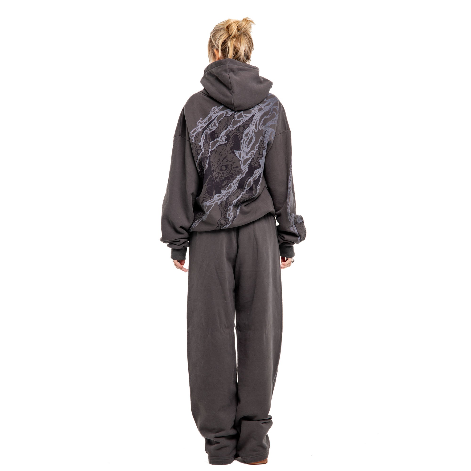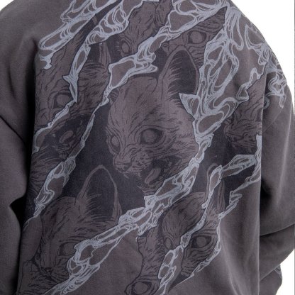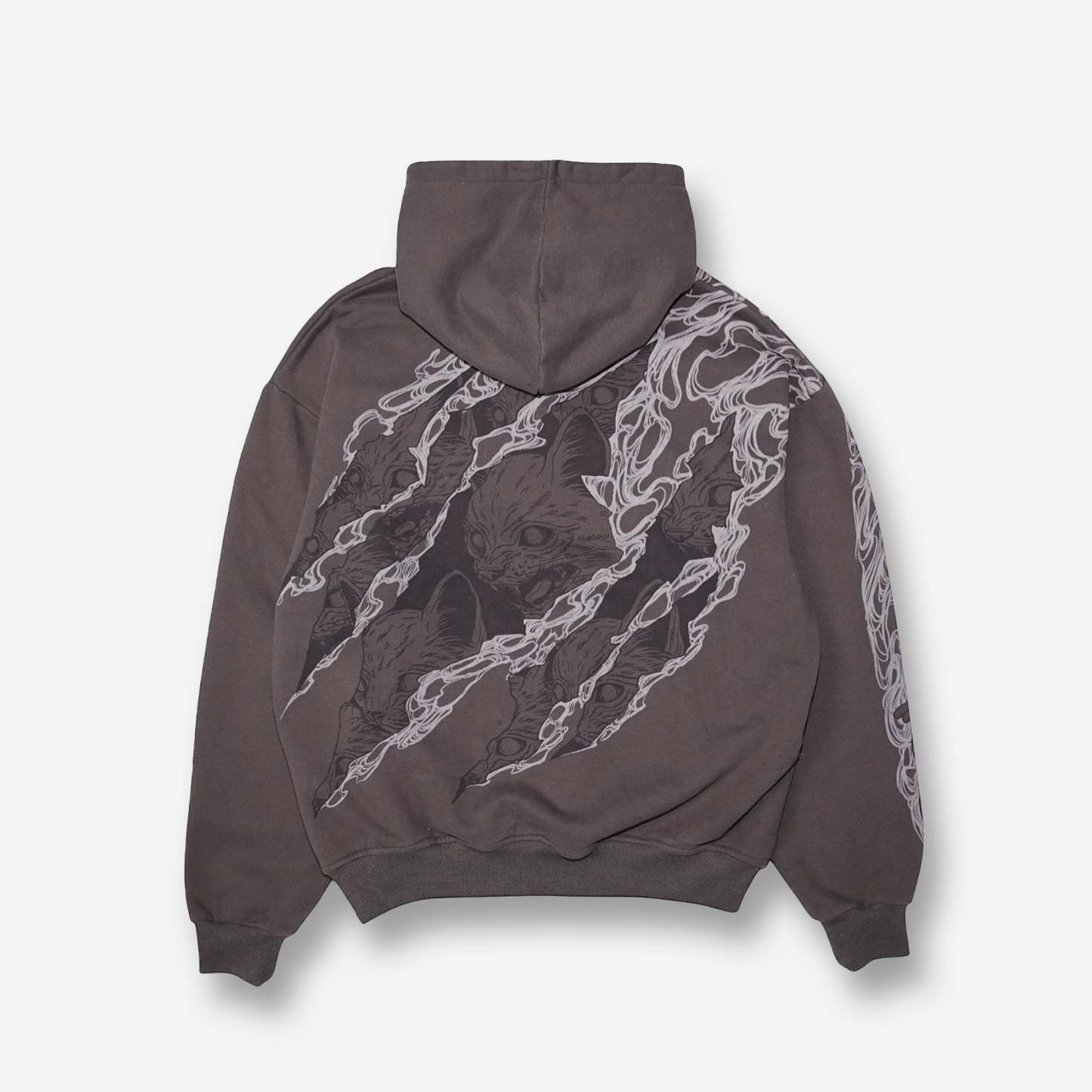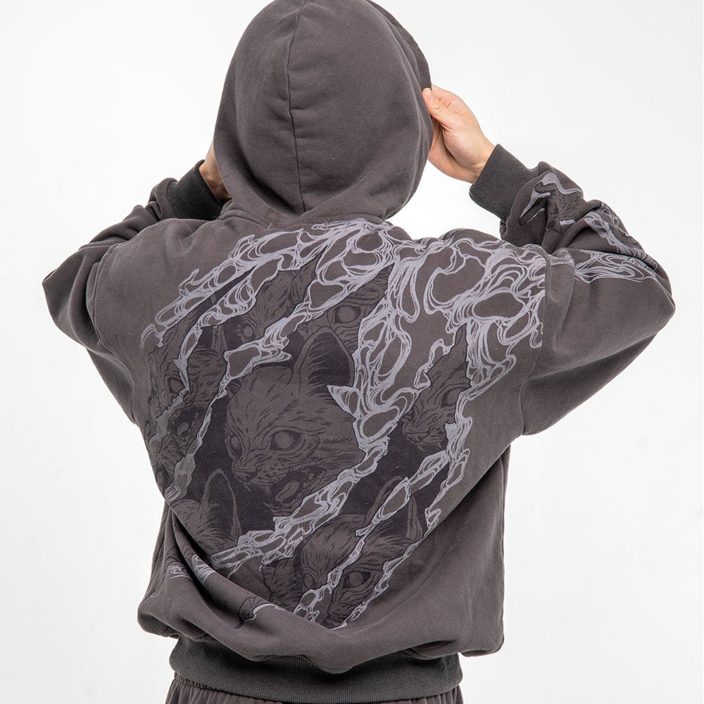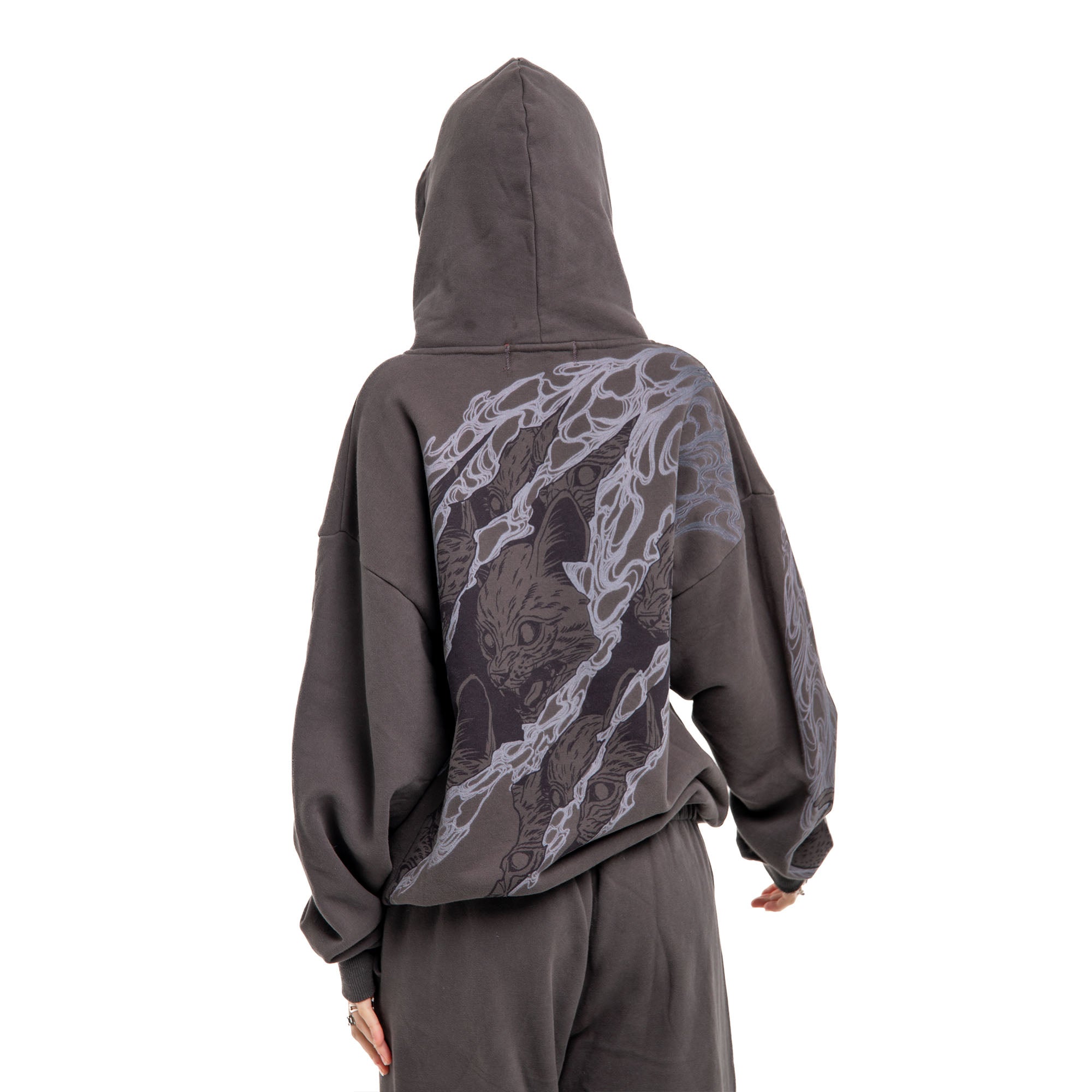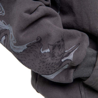 The Bakeneko Hoodie; Inspired by the mythical Bakeneko, a shape-shifting cat from Japanese folklore, this oversized hoodie brings mysticism to modern style. The Bakeneko is said to possess supernatural powers, including controlling fire and summoning spirits, often with a mischievous nature. This hoodie features a striking DTG print of a Bakeneko emerging from smoke on the back, with a smaller Bakeneko cat on the sleeve, capturing the essence of this enigmatic creature.