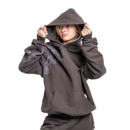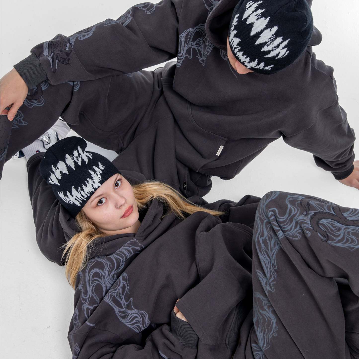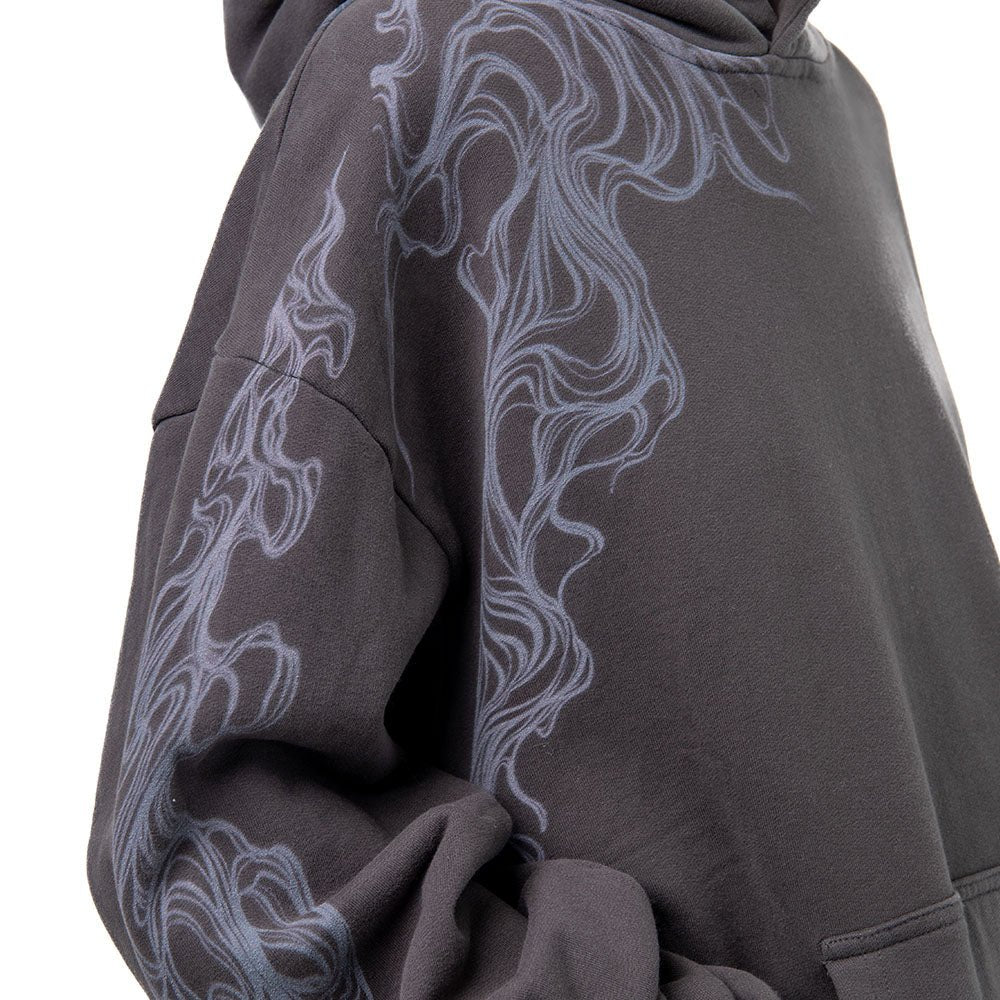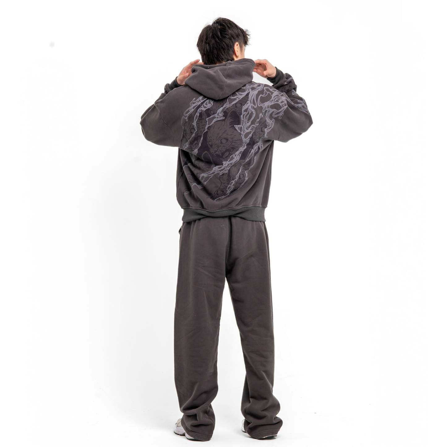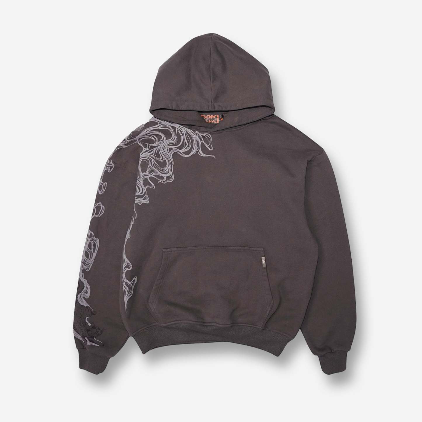 The Bakeneko Hoodie; Inspired by the mythical Bakeneko, a shape-shifting cat from Japanese folklore, this oversized hoodie brings mysticism to modern style. The Bakeneko is said to possess supernatural powers, including controlling fire and summoning spirits, often with a mischievous nature. This hoodie features a striking DTG print of a Bakeneko emerging from smoke on the back, with a smaller Bakeneko cat on the sleeve, capturing the essence of this enigmatic creature.