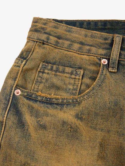 Constructed from durable denim fabric, these shorts feature a heavily washed burnt orange finish that delivers a worn-in, vintage look. The mud-dyed wash treatment creates natural tonal variation, enhancing the Dirty Fit aesthetic. Distressed rips across the front add rebellious Grunge character, making the piece an easy standout when paired with oversized tees or sport jerseys. Designed with a structured knee-length cut, it balances rugged texture with everyday wearability.