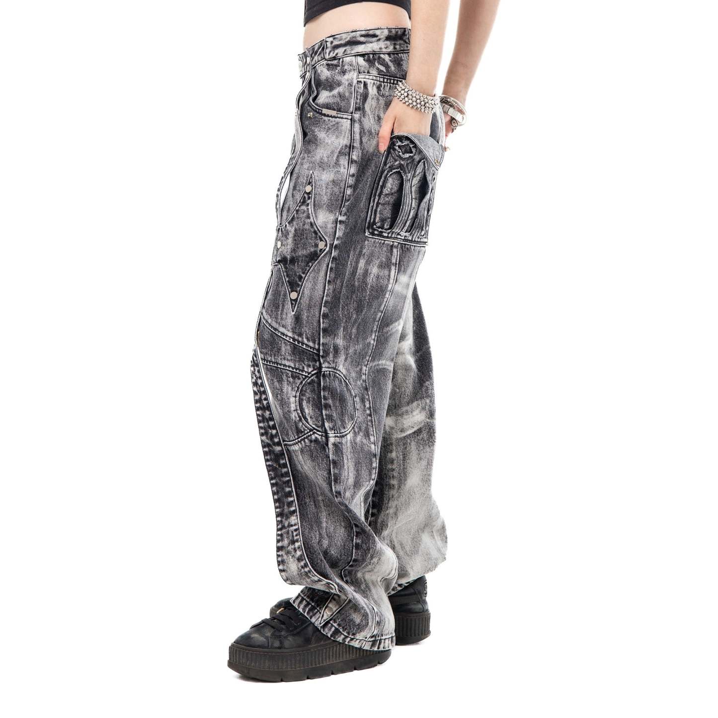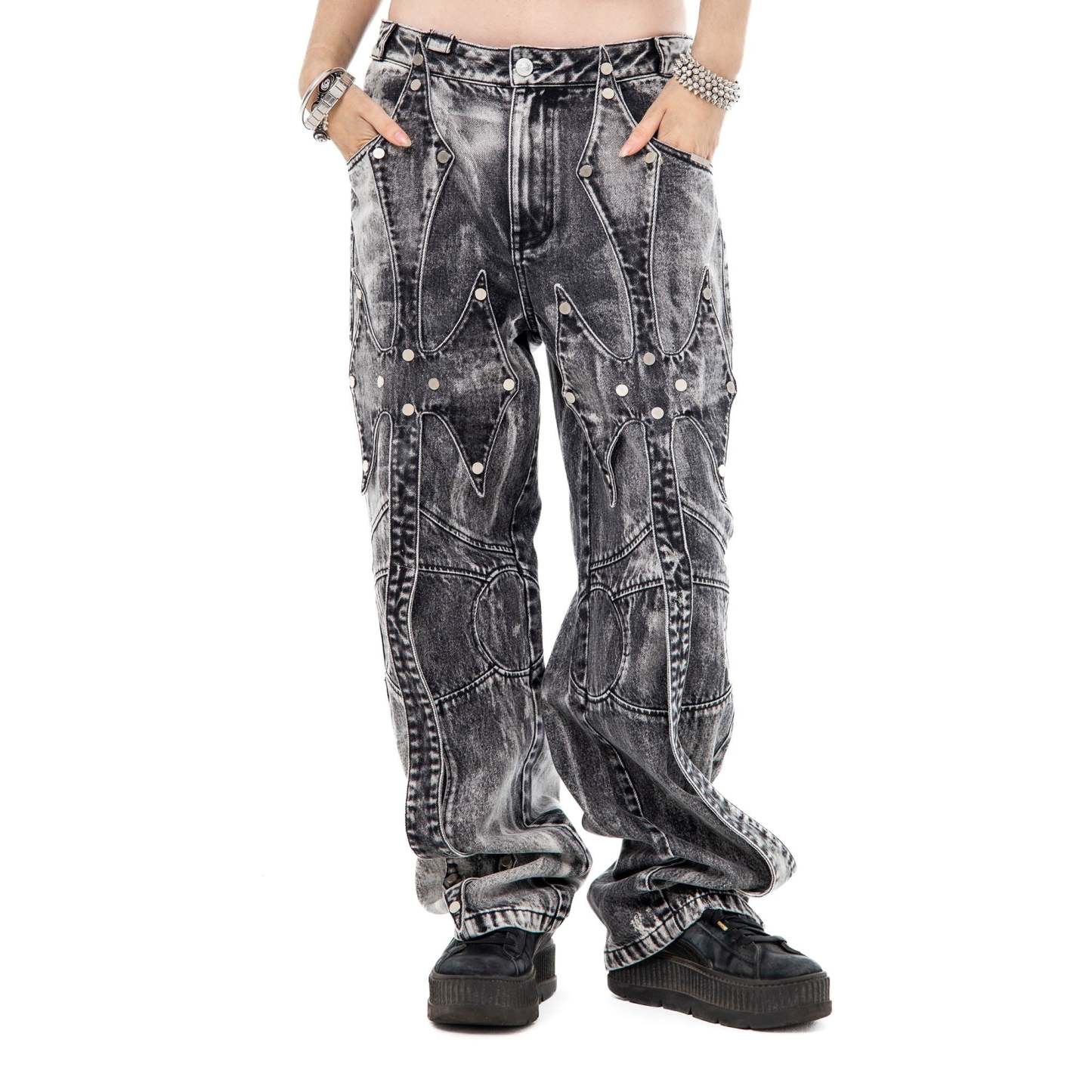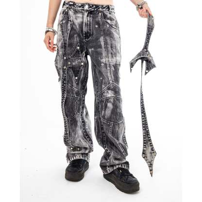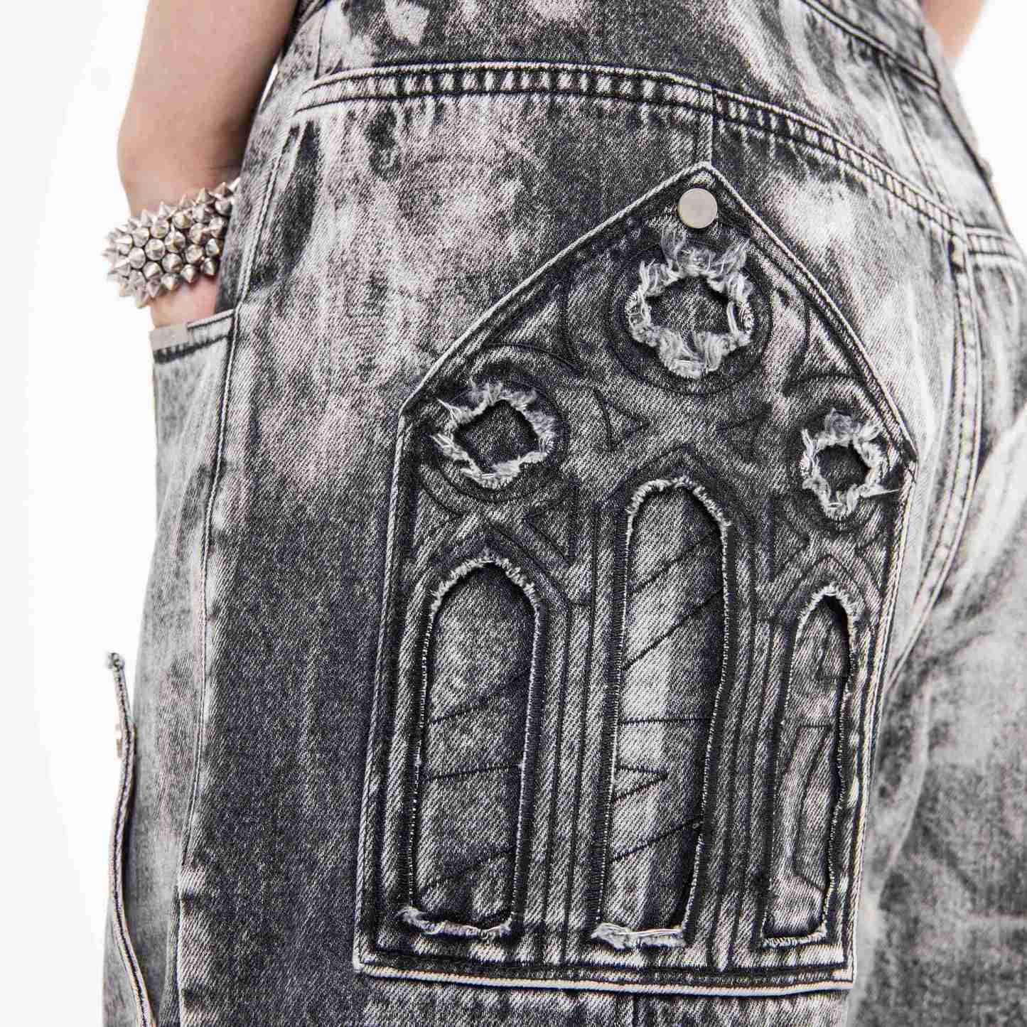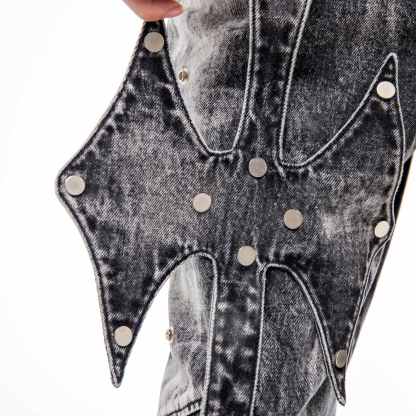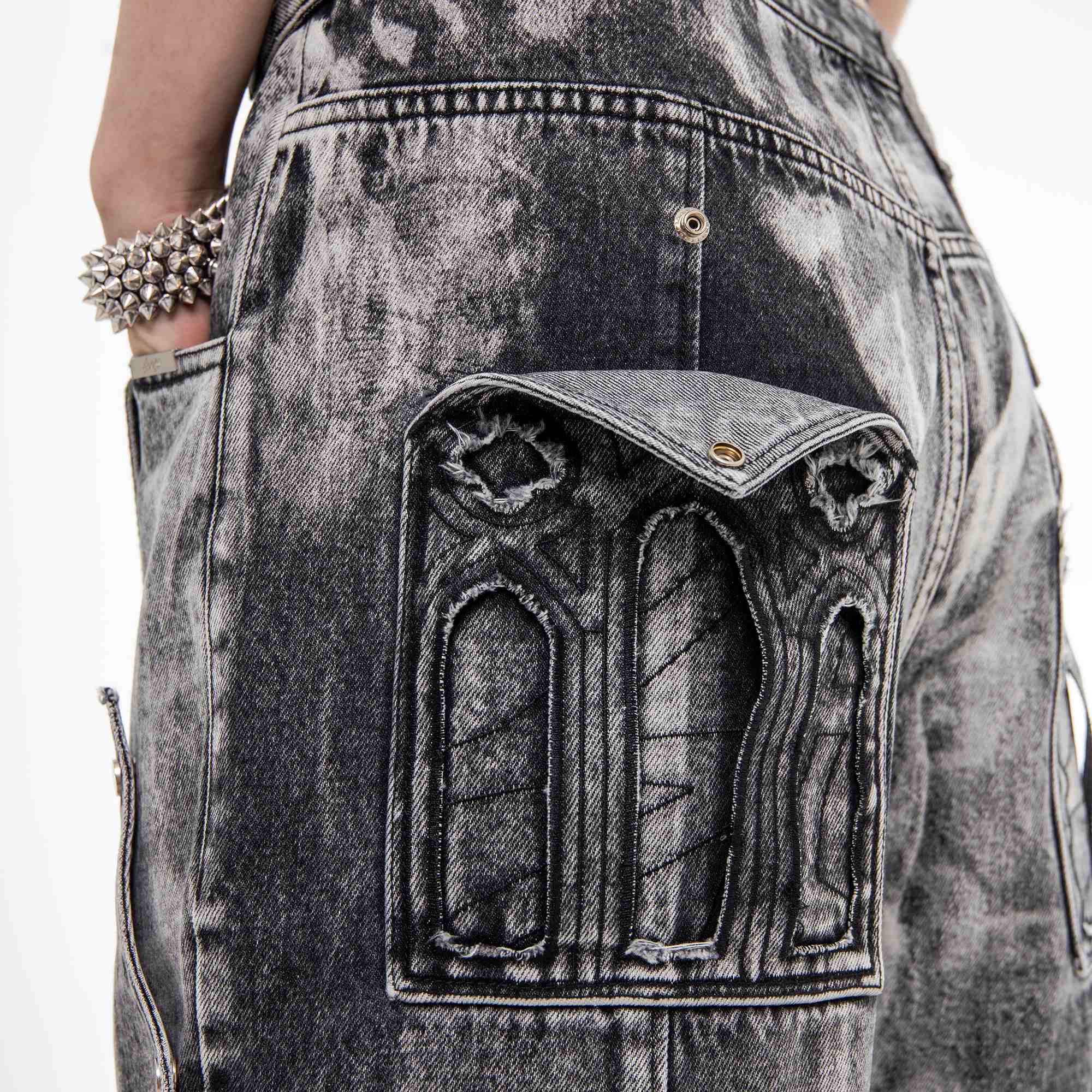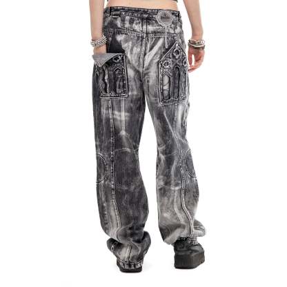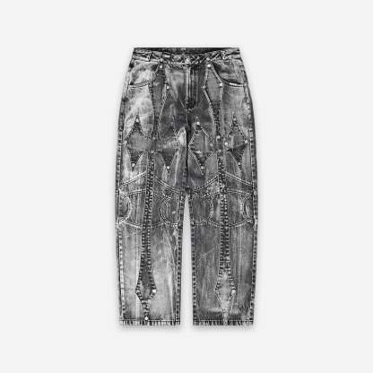 Divine Jeans blend trompe l'oeil splatter detailing with a dirty mineral tint across heavy-weight denim. Detachable reversible cross patches secured by custom silver snaps allow for versatile styling, while a chenille wax seal adorns the back waistband. Double-layer back pockets feature raw-edge finishes and cutout details, complemented by a black satin embroidered inner fly and silver metal emblem on the leather pocket patch.