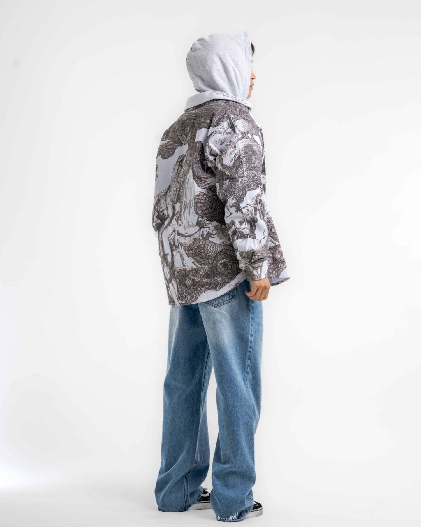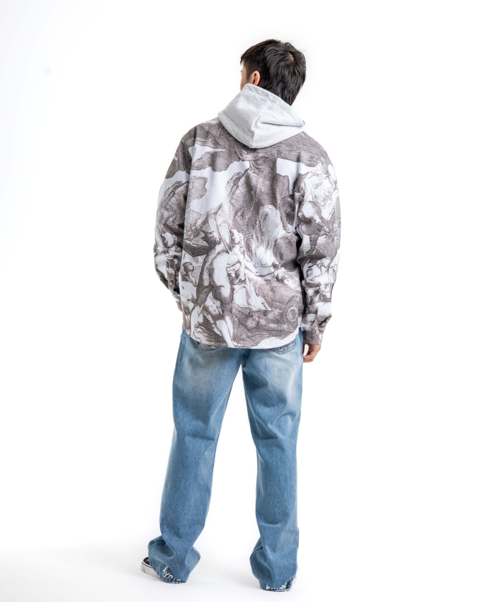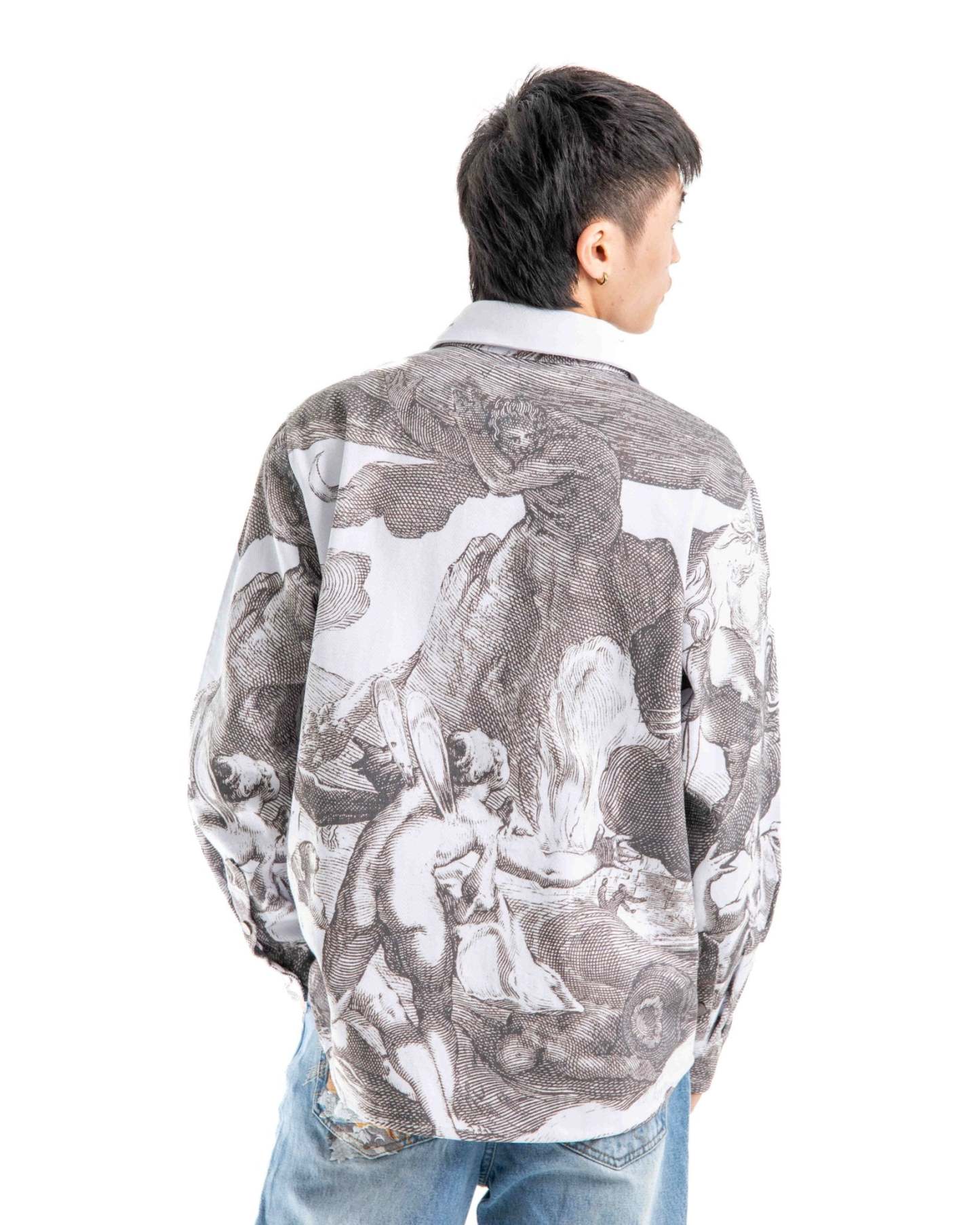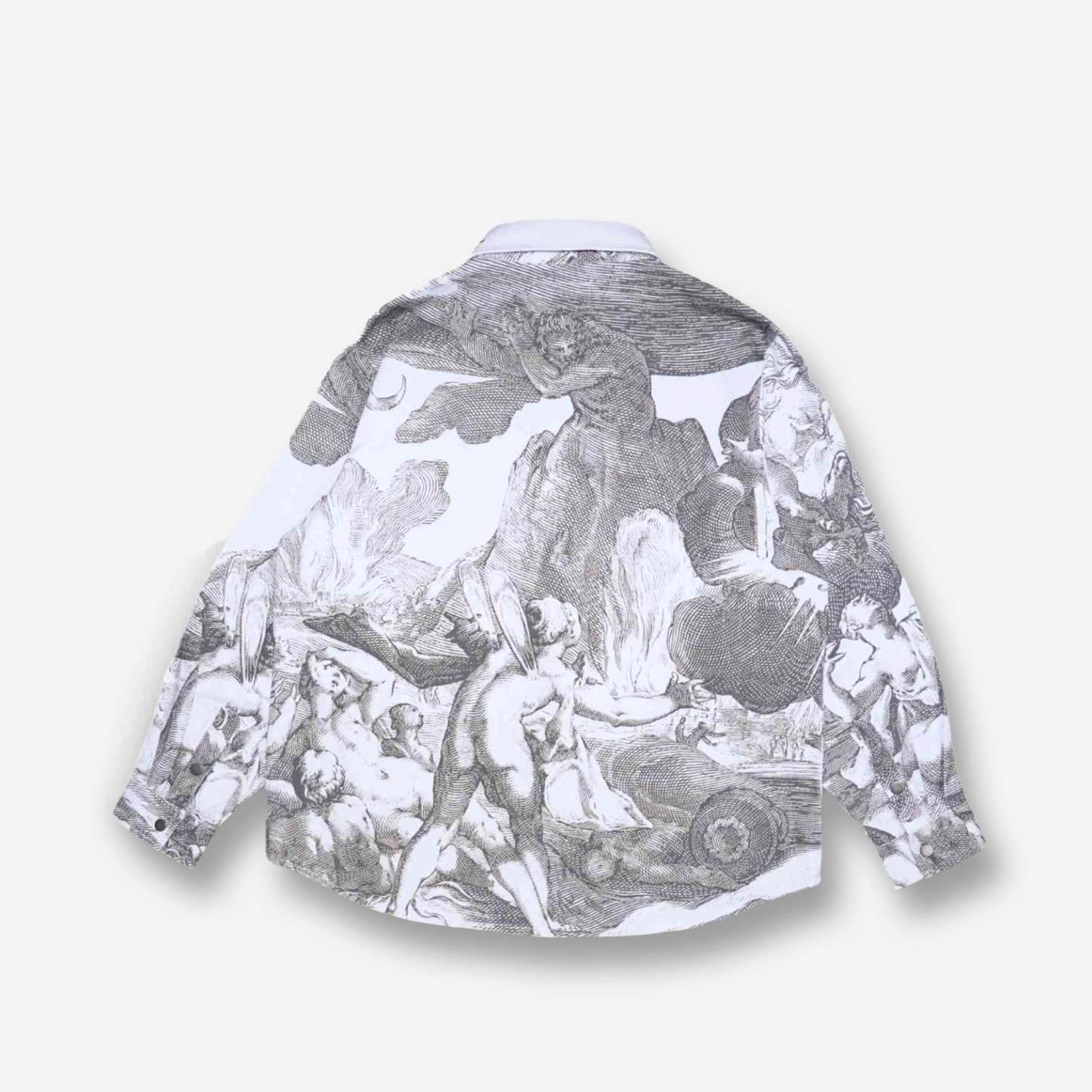 Fall of Phaeton Shacket with a relaxed fit, crafted from heavyweight cotton twill. Designed to be versatile—wear it as a shirt, light jacket, or mid-layer for extra warmth. Features a bold print inspired by the mythological masterpiece "The Fall of Phaeton."