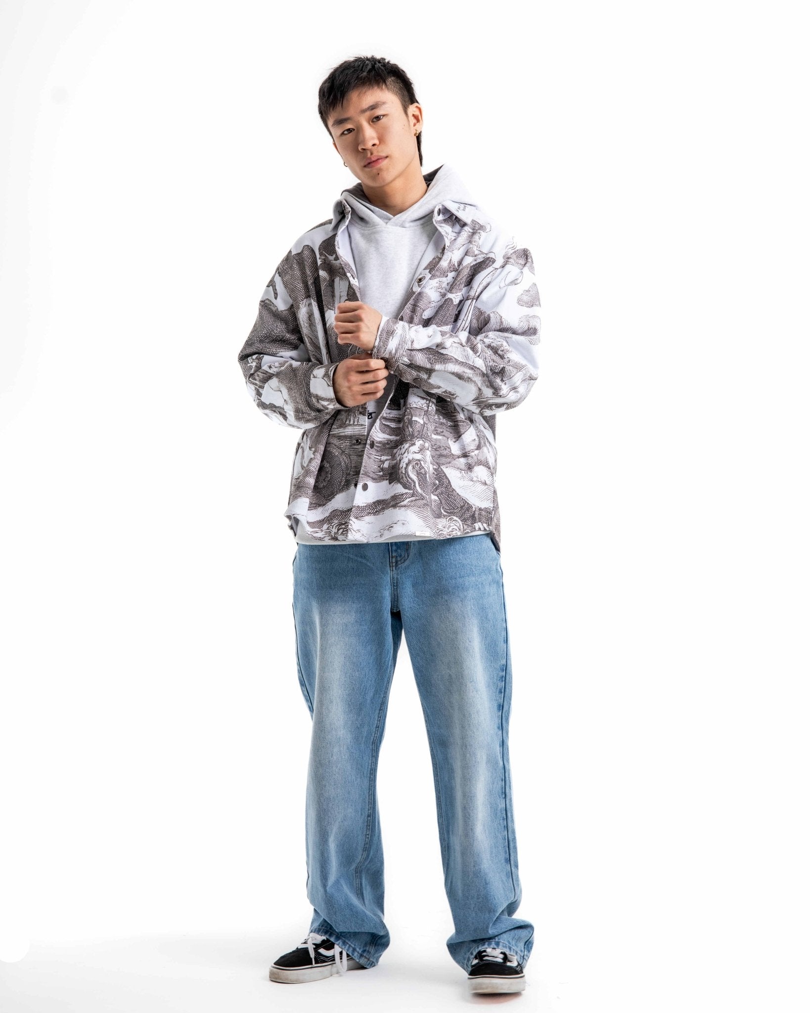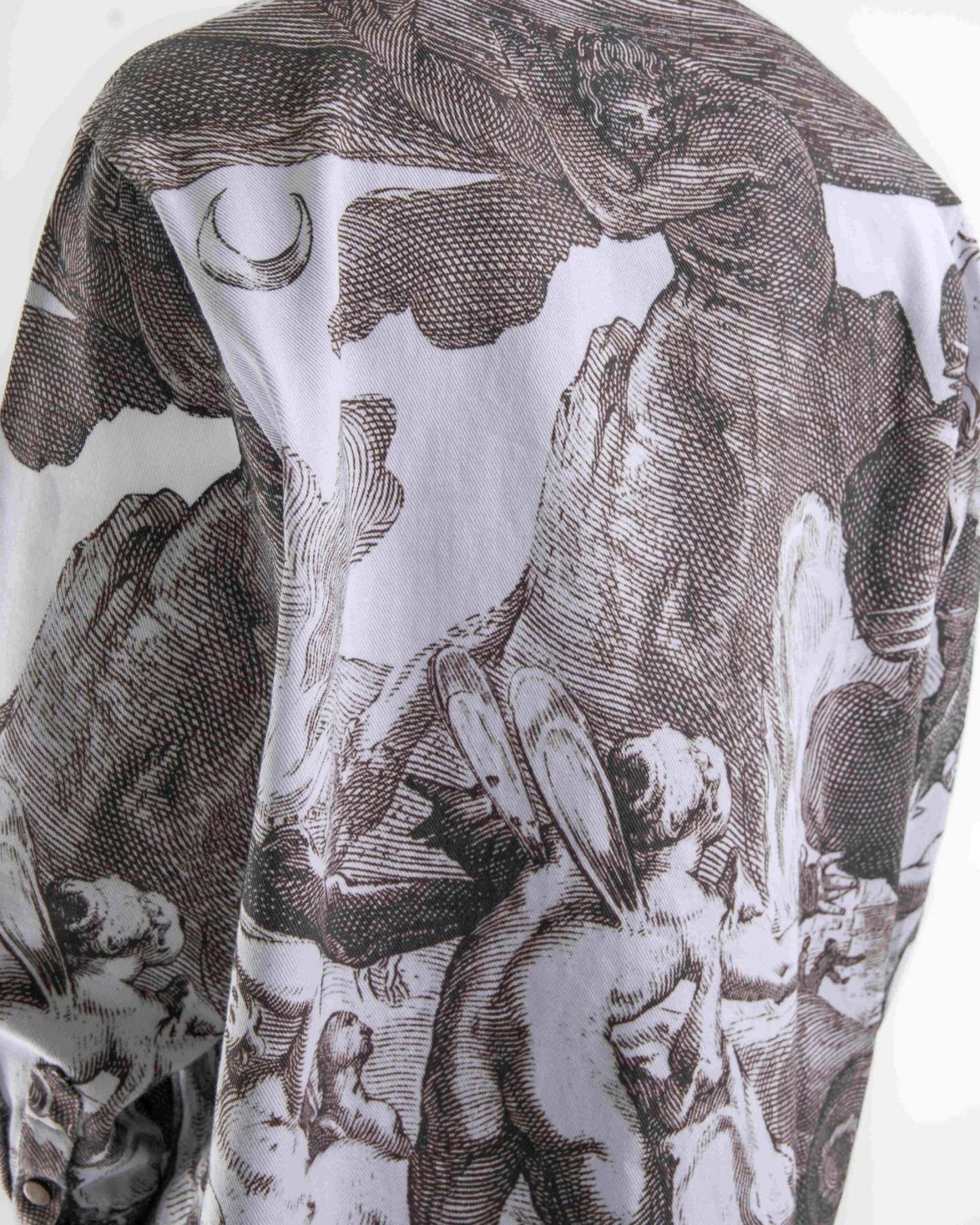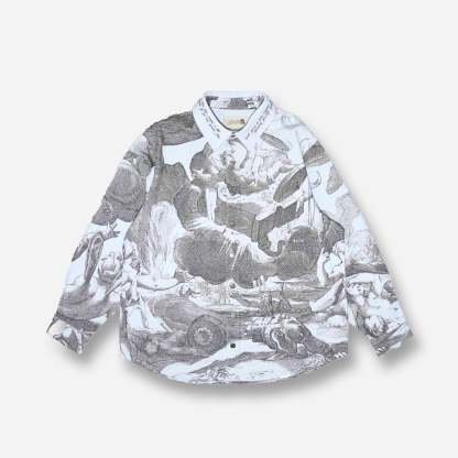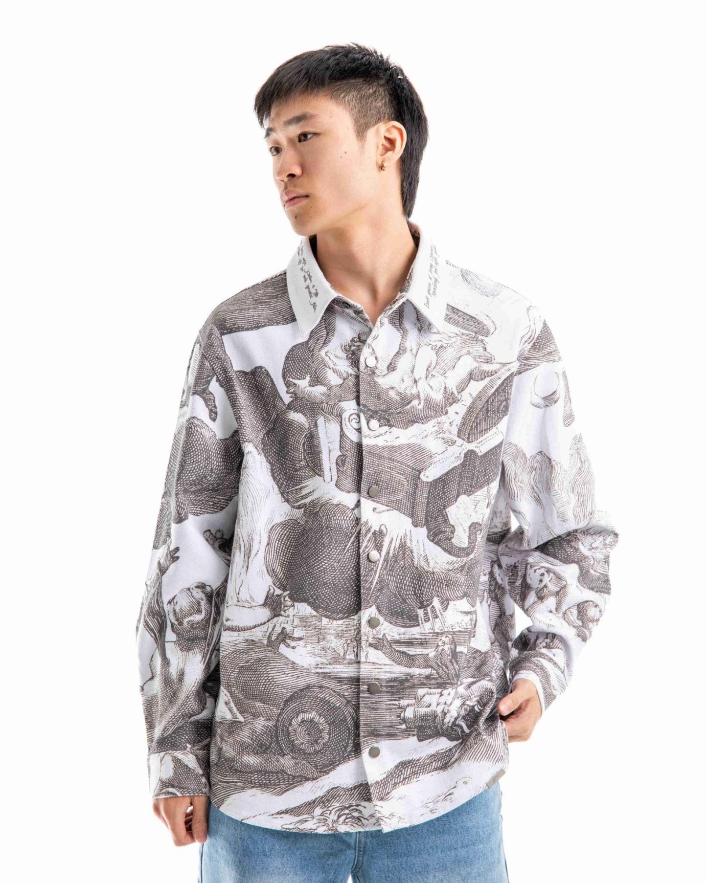 Fall of Phaeton Shacket with a relaxed fit, crafted from heavyweight cotton twill. Designed to be versatile—wear it as a shirt, light jacket, or mid-layer for extra warmth. Features a bold print inspired by the mythological masterpiece "The Fall of Phaeton."