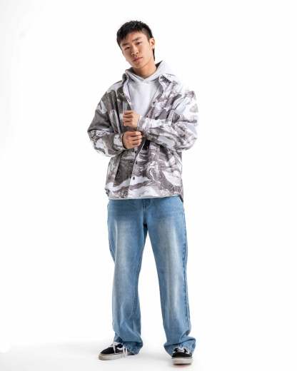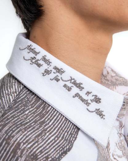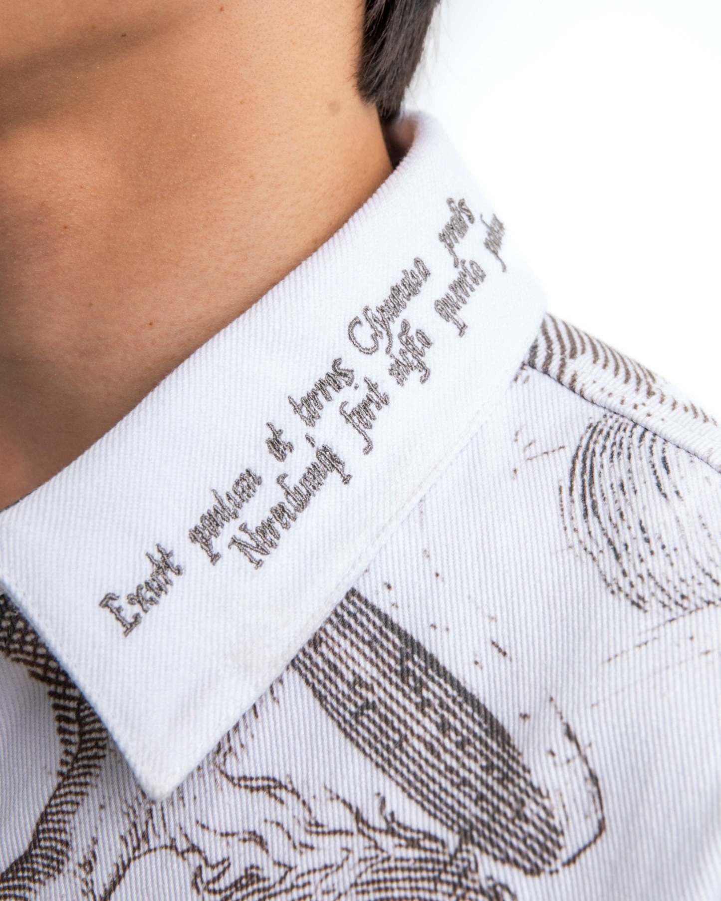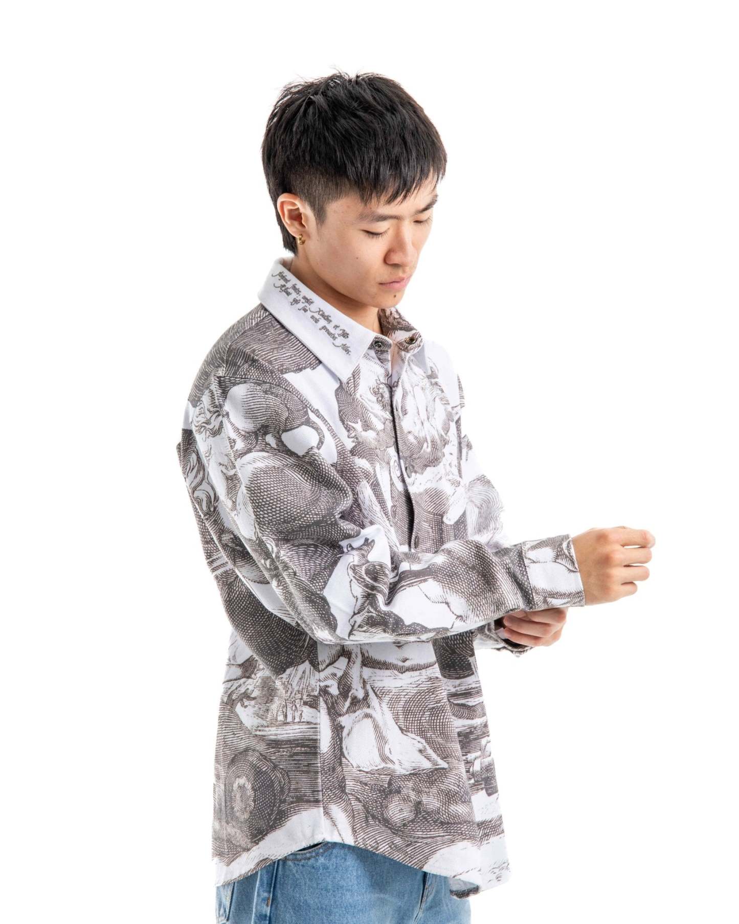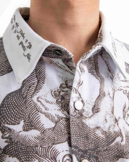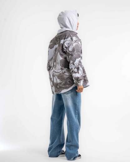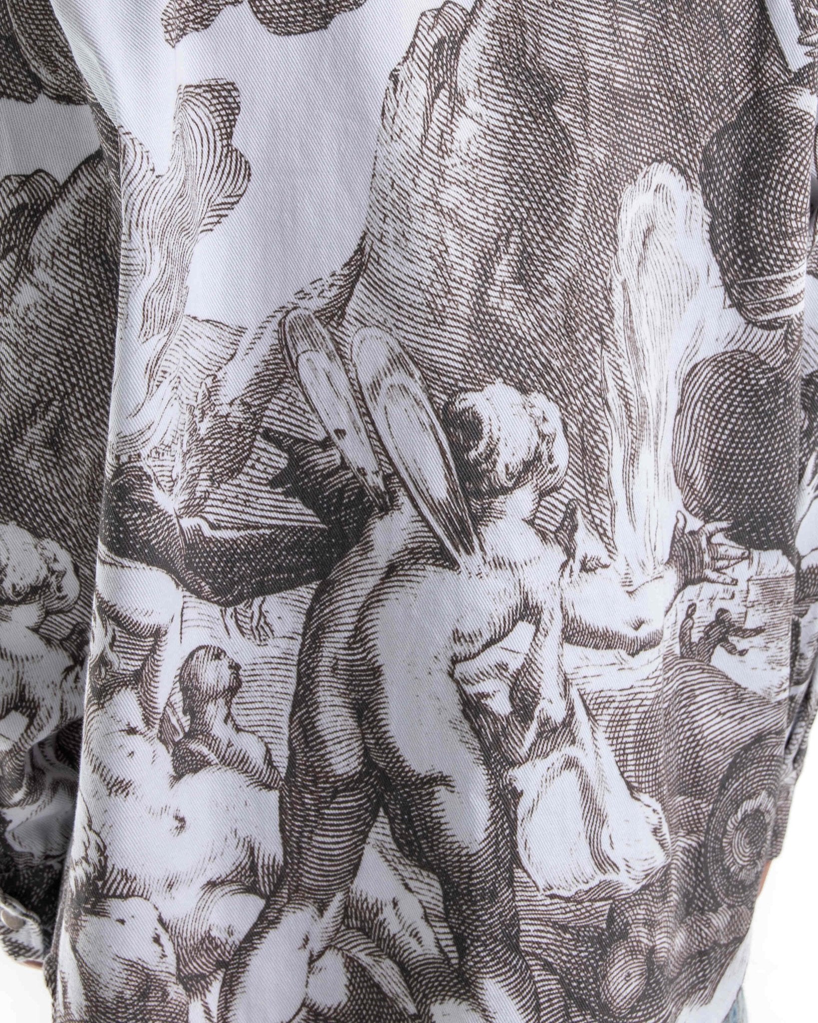 Fall of Phaeton Shacket with a relaxed fit, crafted from heavyweight cotton twill. Designed to be versatile—wear it as a shirt, light jacket, or mid-layer for extra warmth. Features a bold print inspired by the mythological masterpiece "The Fall of Phaeton."