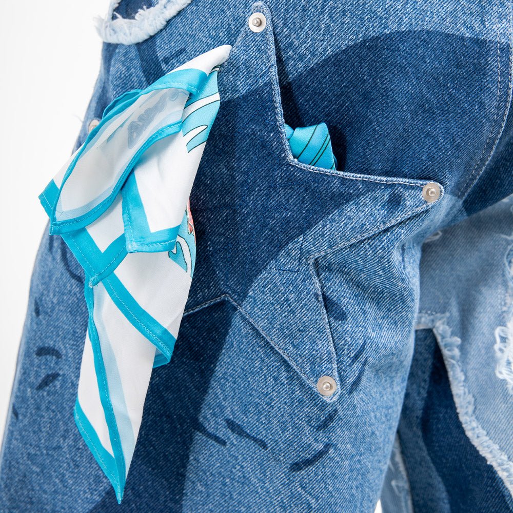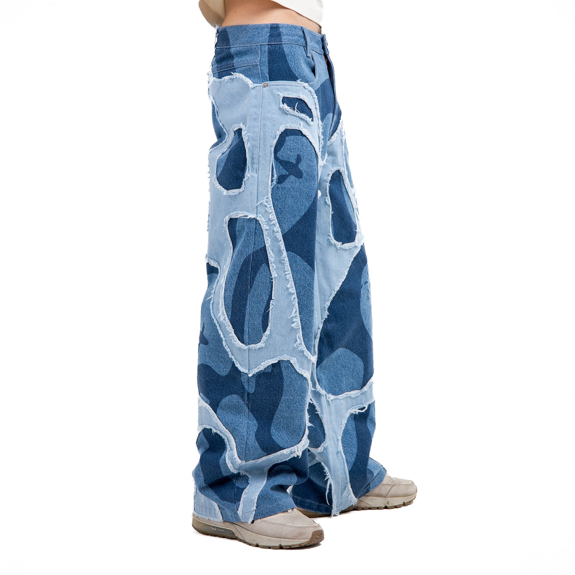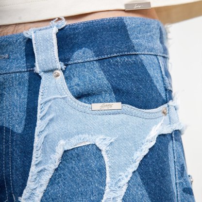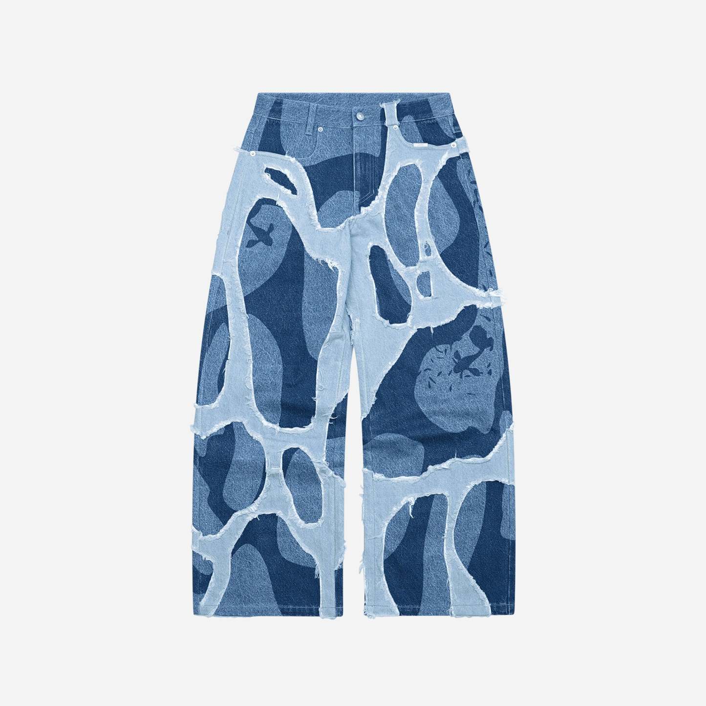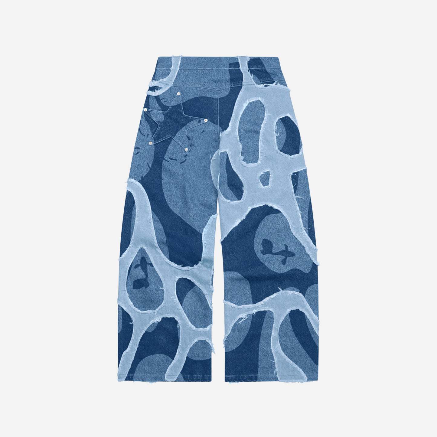 Tidal Pool Jeans feature a underwater aesthetic stone wash finish with silver metal hardware and a custom-embossed front button. Built with functional belt loops and dual-sided pockets.