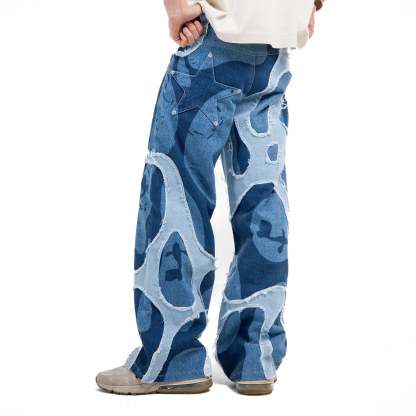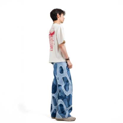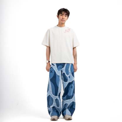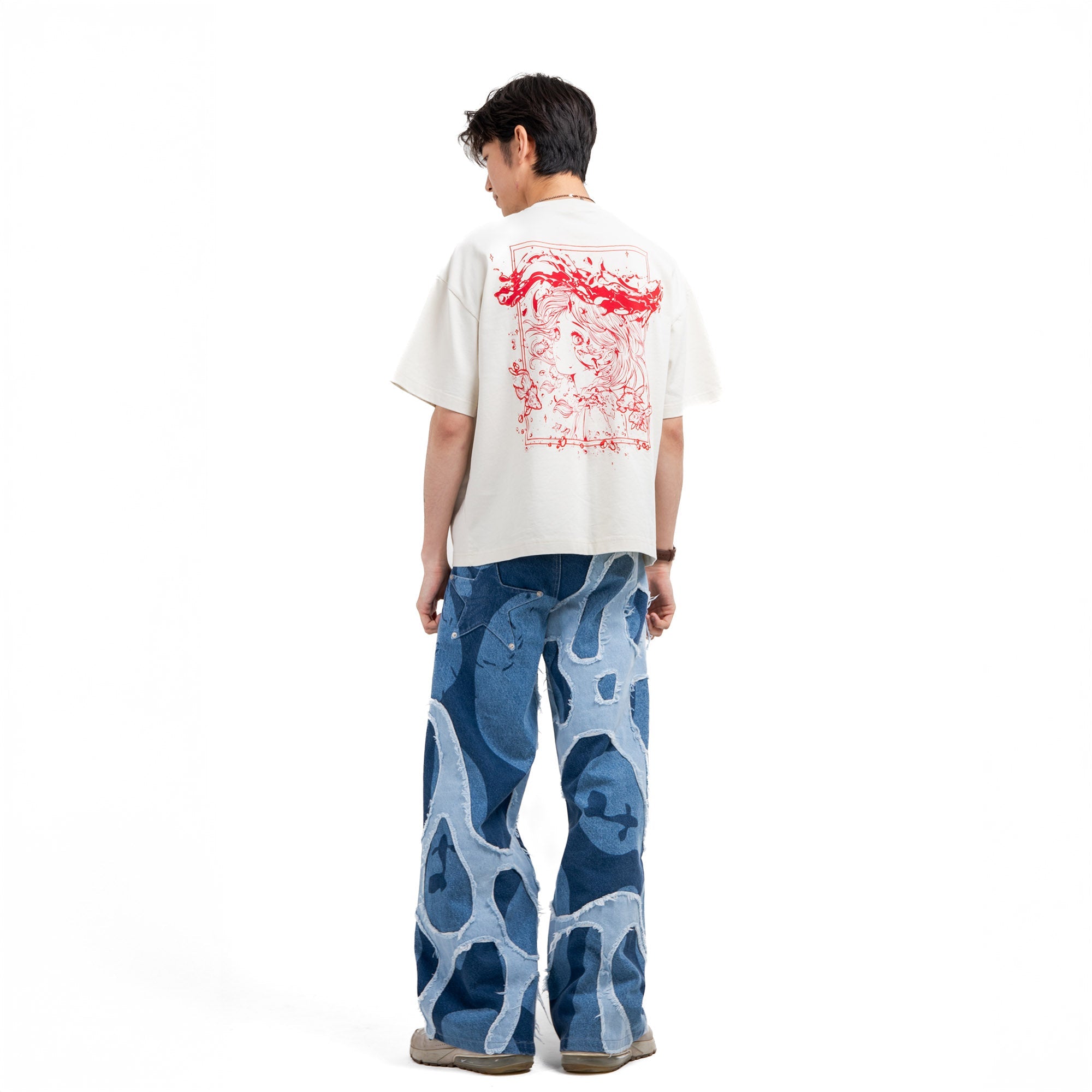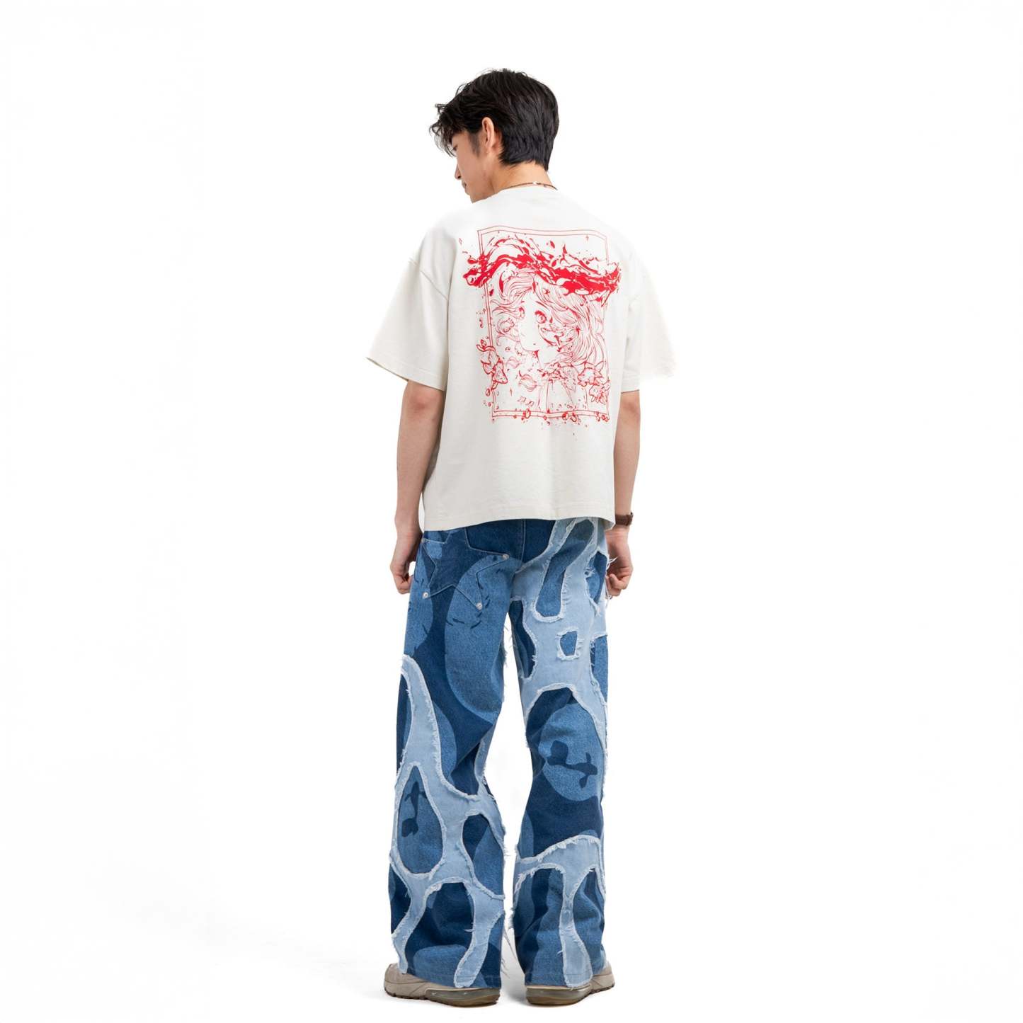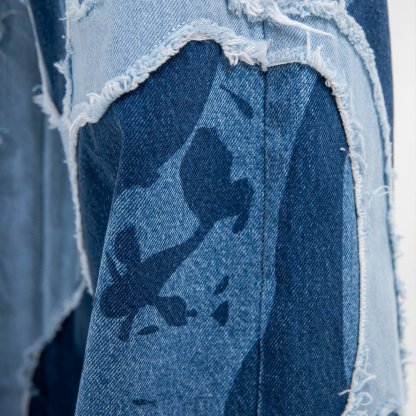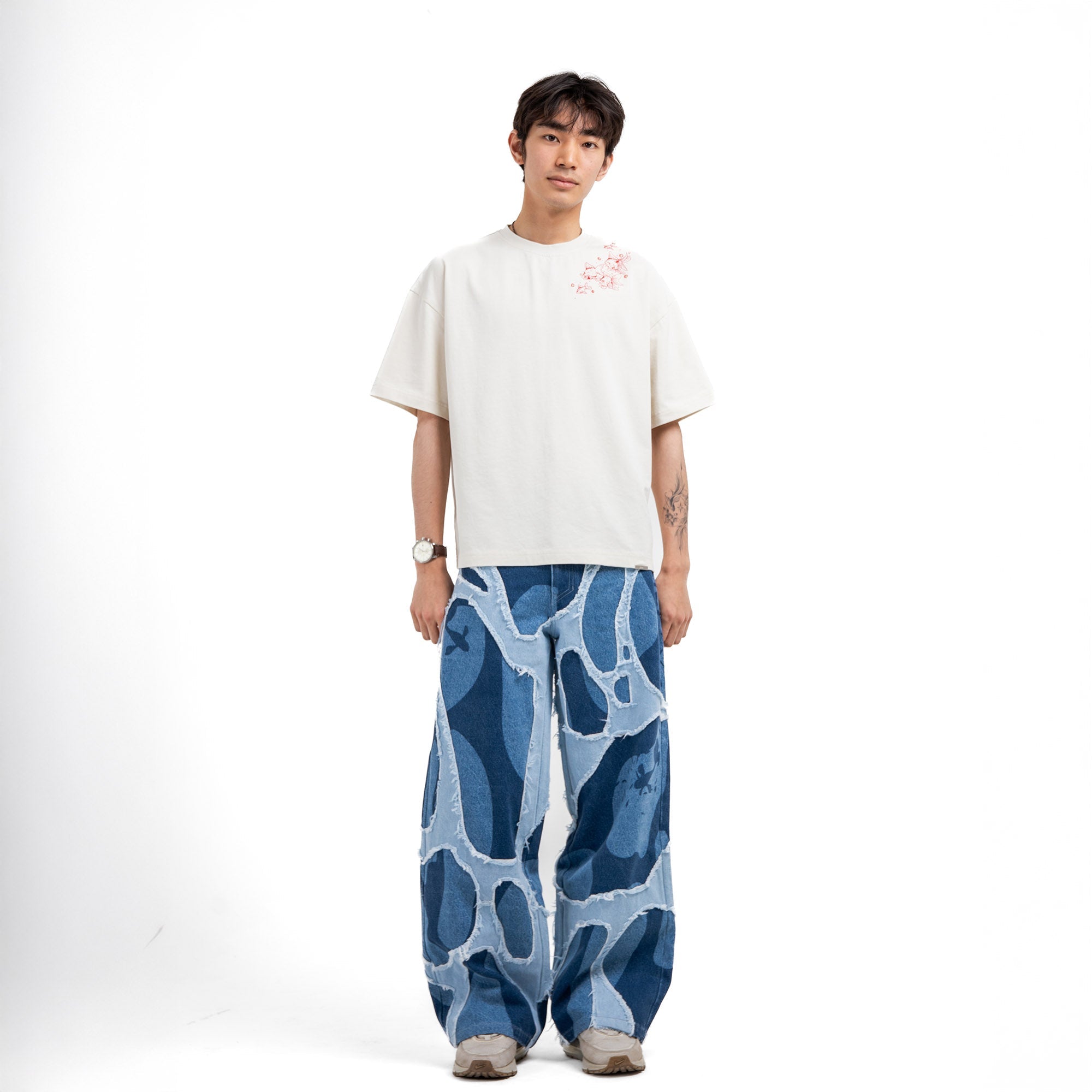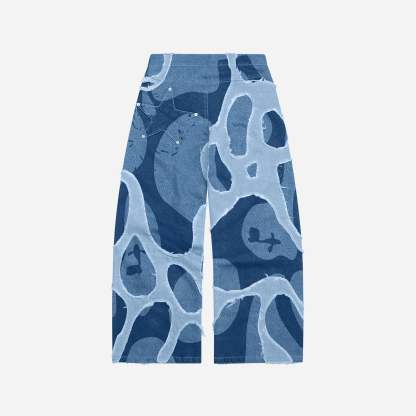 Tidal Pool Jeans feature a underwater aesthetic stone wash finish with silver metal hardware and a custom-embossed front button. Built with functional belt loops and dual-sided pockets.