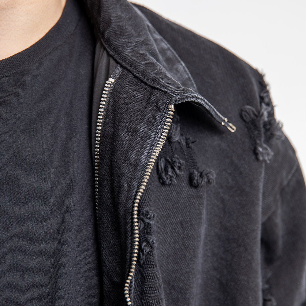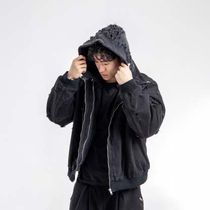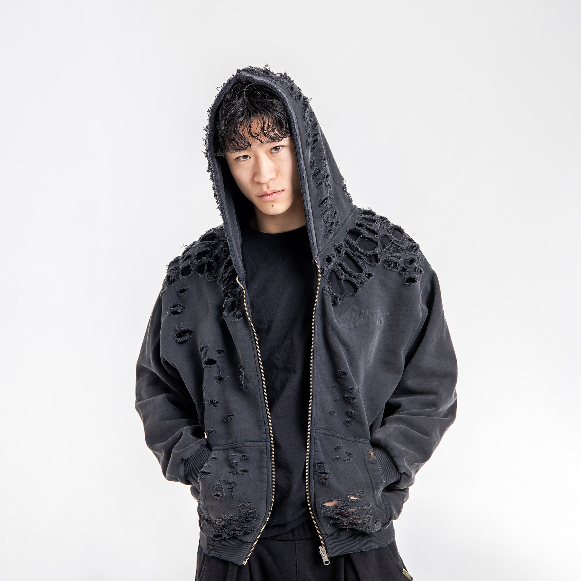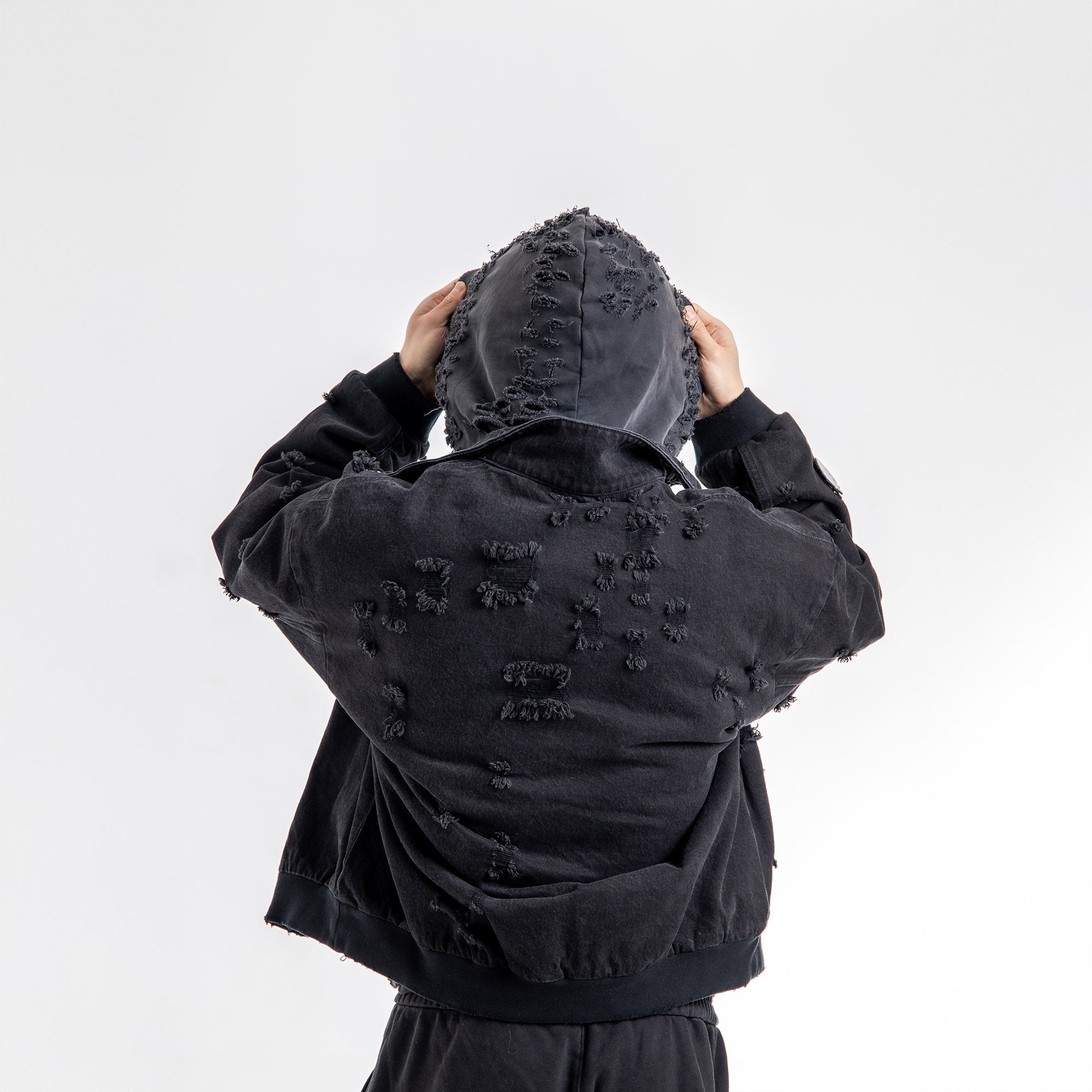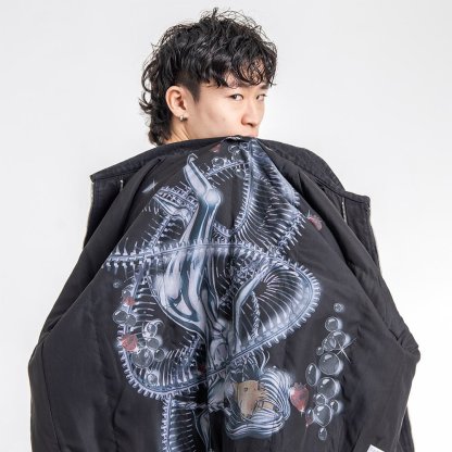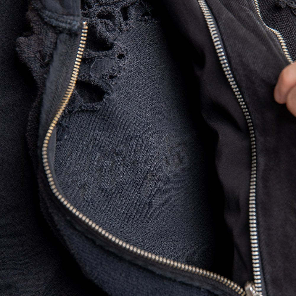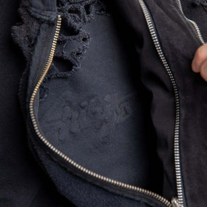 An all seasons 3 in 1 interchange jacket featuring custom metal collar protector hardware and YKK zippers. Inner hoodie is upcycled from deadstock and given new life featuring handmade distressing and a fresh overdye with a vintage feel. Open it up and find a fully sublimated lining featuring Kyra in the mysterious Void realm. Where just the hoodie for hotter days, just the shell for chilly days, wear the entire jacket to give it a layered look that keeps you warm on cold days.