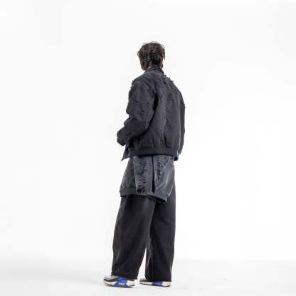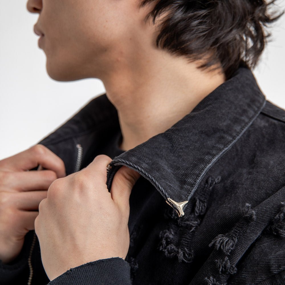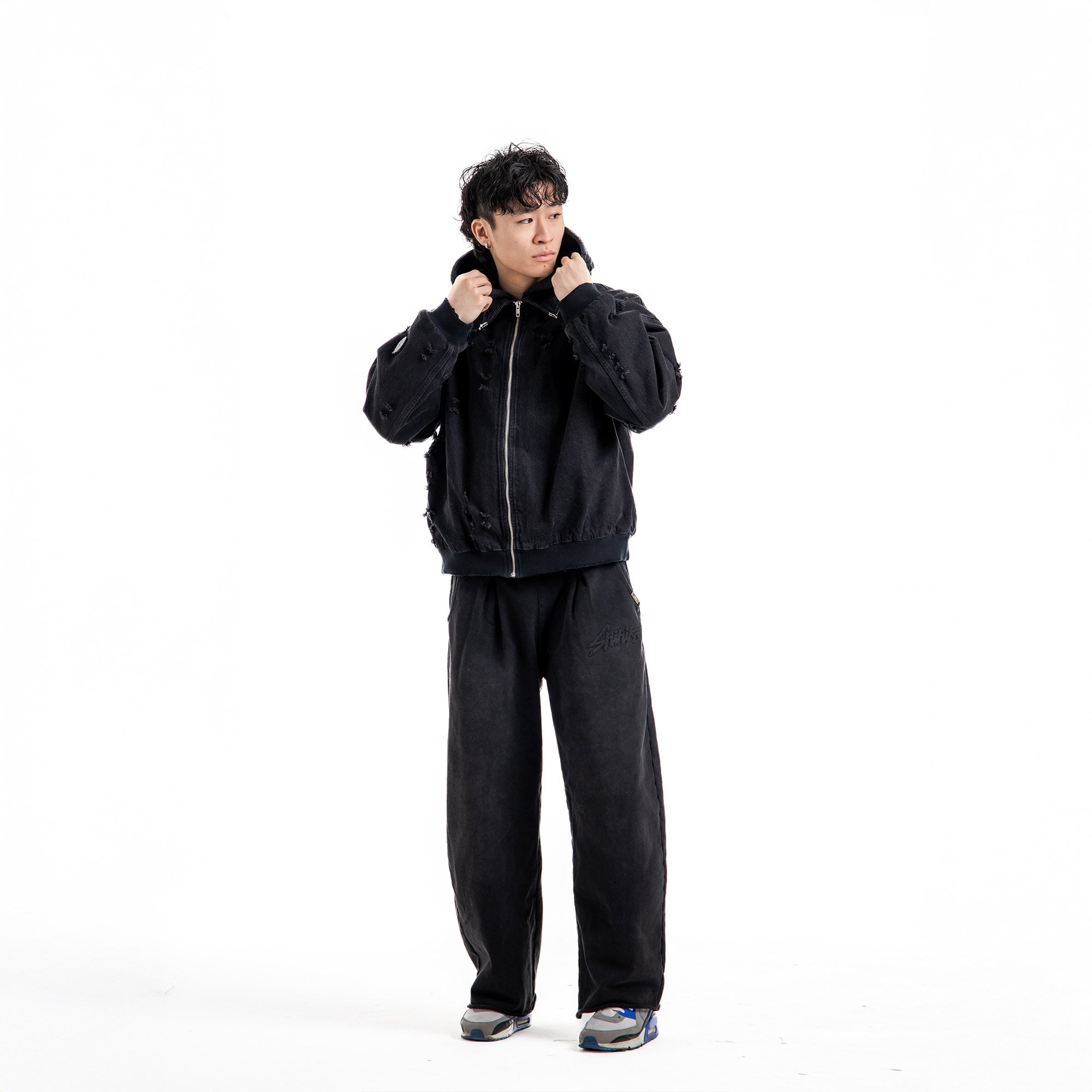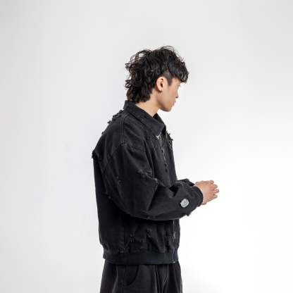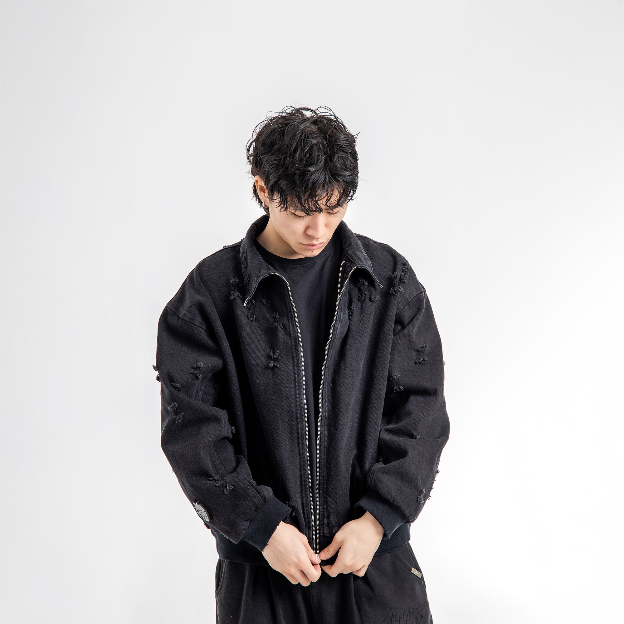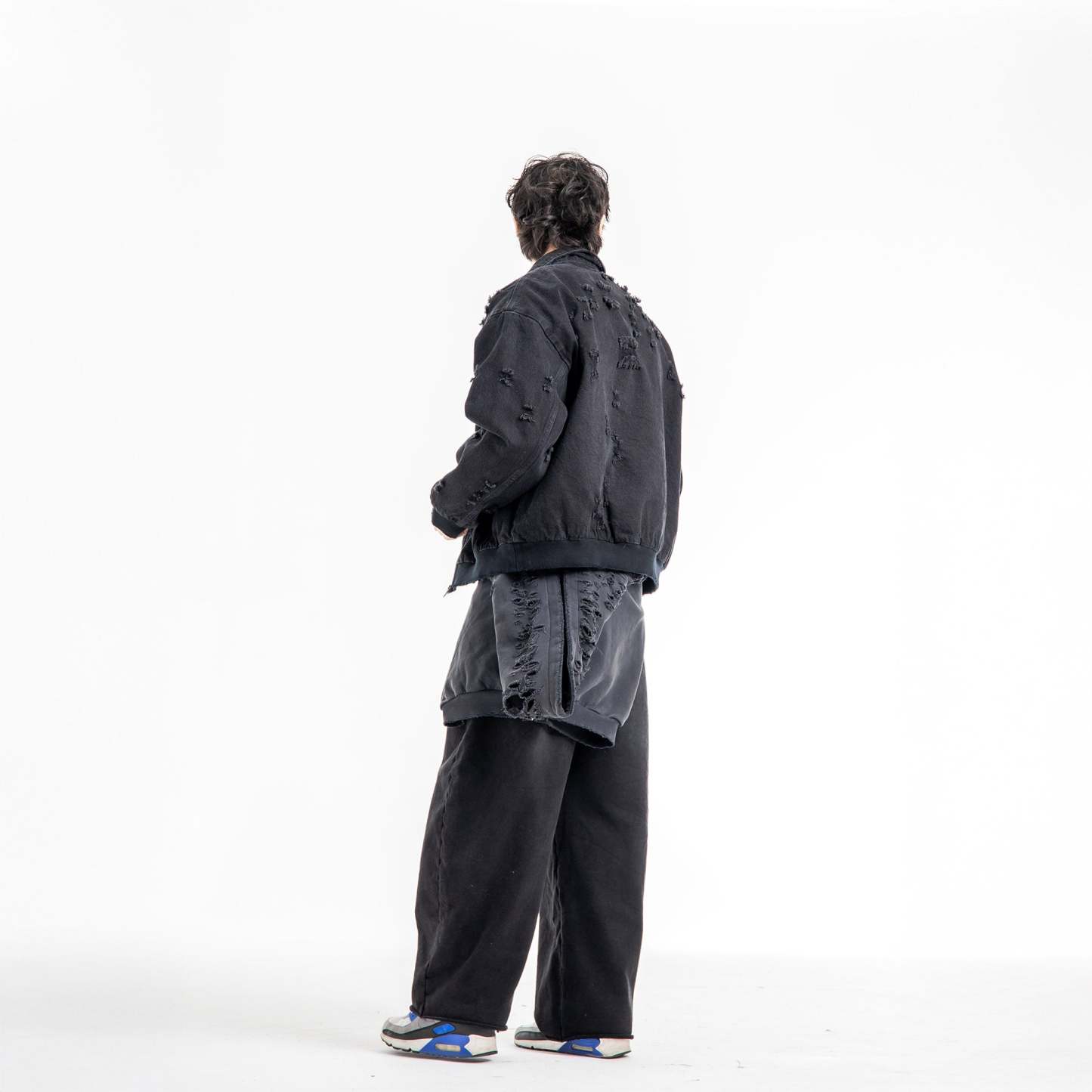 An all seasons 3 in 1 interchange jacket featuring custom metal collar protector hardware and YKK zippers. Inner hoodie is upcycled from deadstock and given new life featuring handmade distressing and a fresh overdye with a vintage feel. Open it up and find a fully sublimated lining featuring Kyra in the mysterious Void realm. Where just the hoodie for hotter days, just the shell for chilly days, wear the entire jacket to give it a layered look that keeps you warm on cold days.