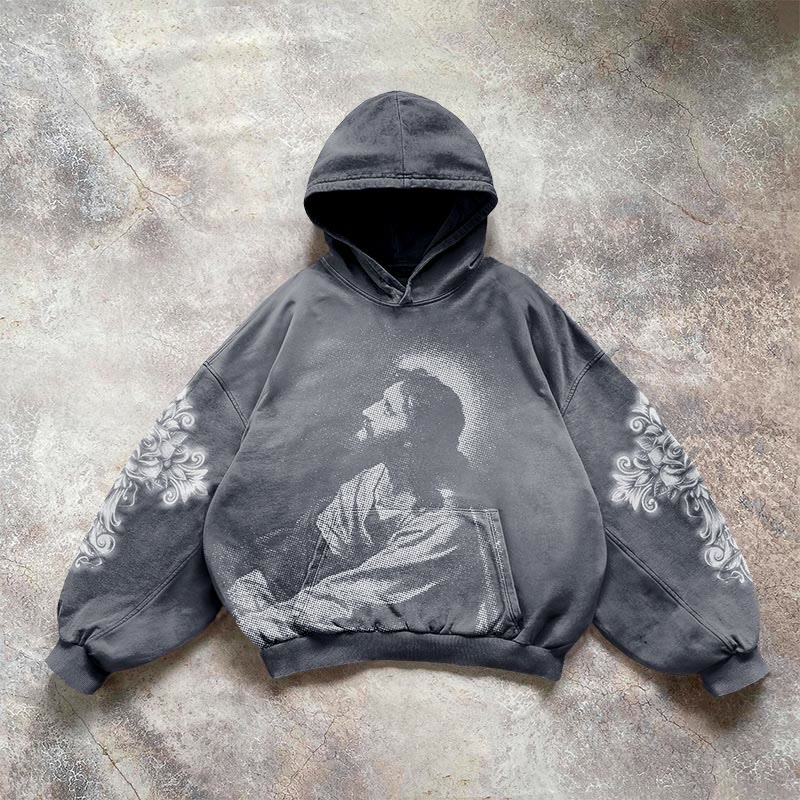 Jesus Face Print Acid Washed Causal Hoodie