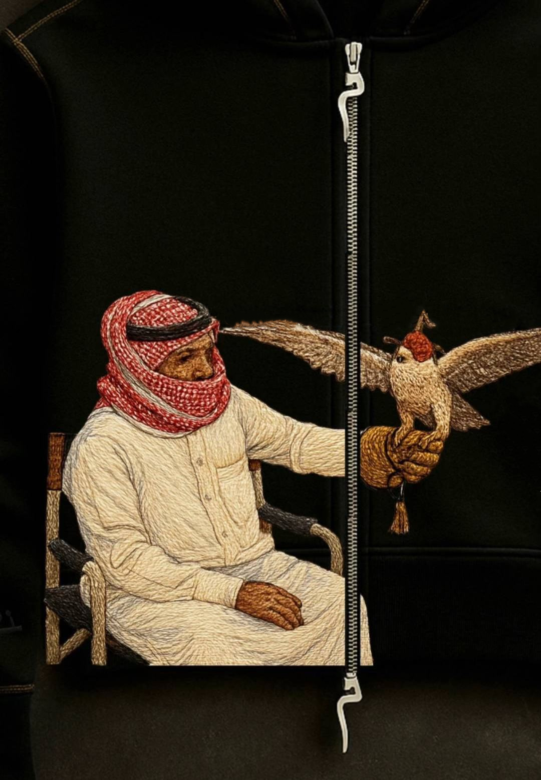 Every stitch on this hoodie pays homage to the Arabian Peninsula’s ancient falconry legacy—an art once reserved for nobles, symbolizing courage, wisdom, and royal heritage. Here’s how we brought this legacy to life: