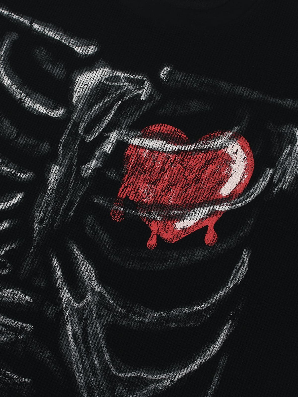 Constructed from textured waffle knit fabric, this graphic tee features a relaxed silhouette with a bold street-grunge visual. The front showcases a hand-drawn skeleton rib graphic layered with a cracked heart motif, while the back is finished with an oversized melted heart print and distressed typography. Faded abrasion and crackle ink treatment enhance the naturally worn, aged effect.